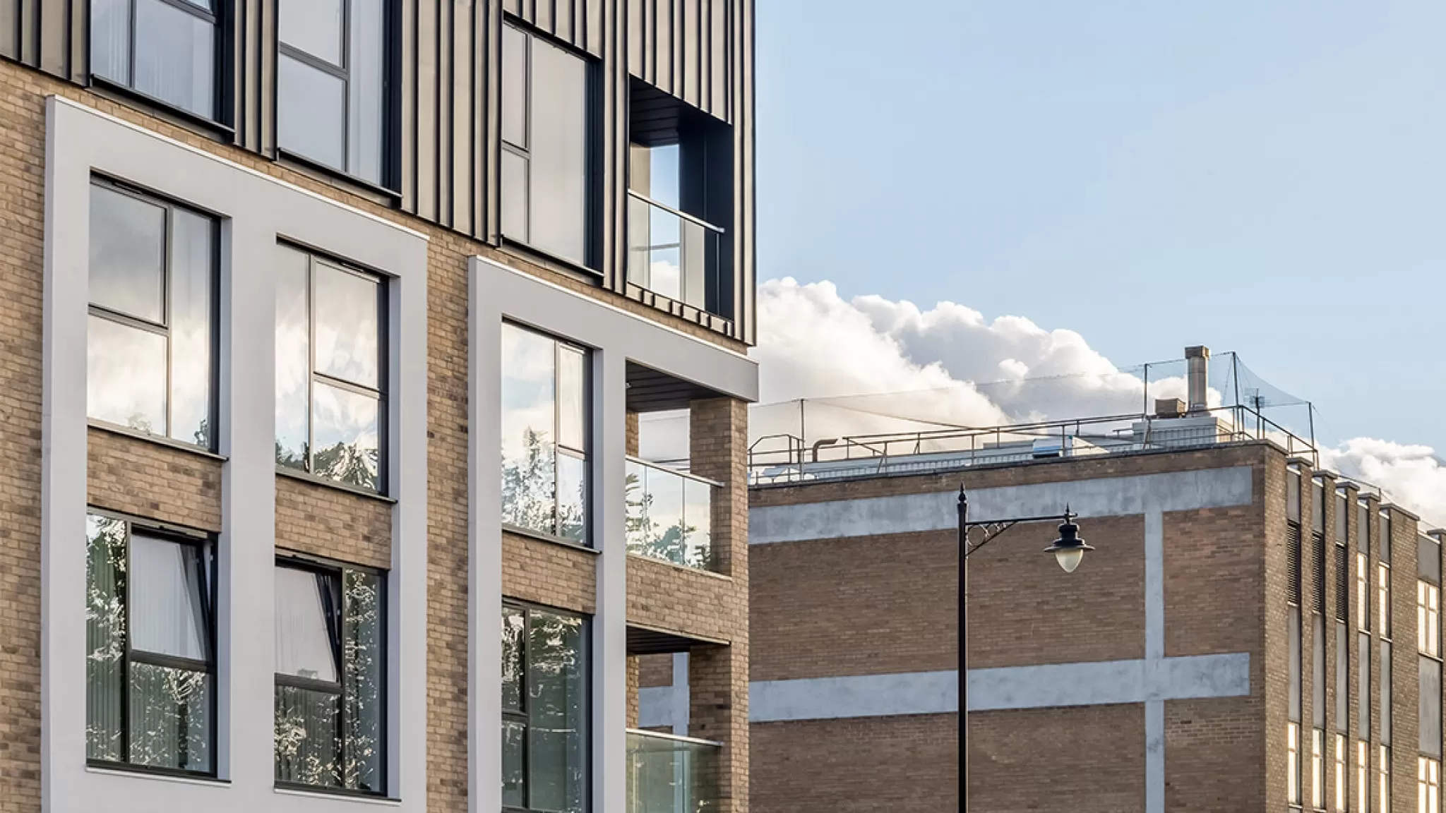 Contemporary brick tones & fenestration, frame render panels and anthracite zinc cladding, and corner glass balconies provide a building with a great presence seen from all angles on William Hunter Way.