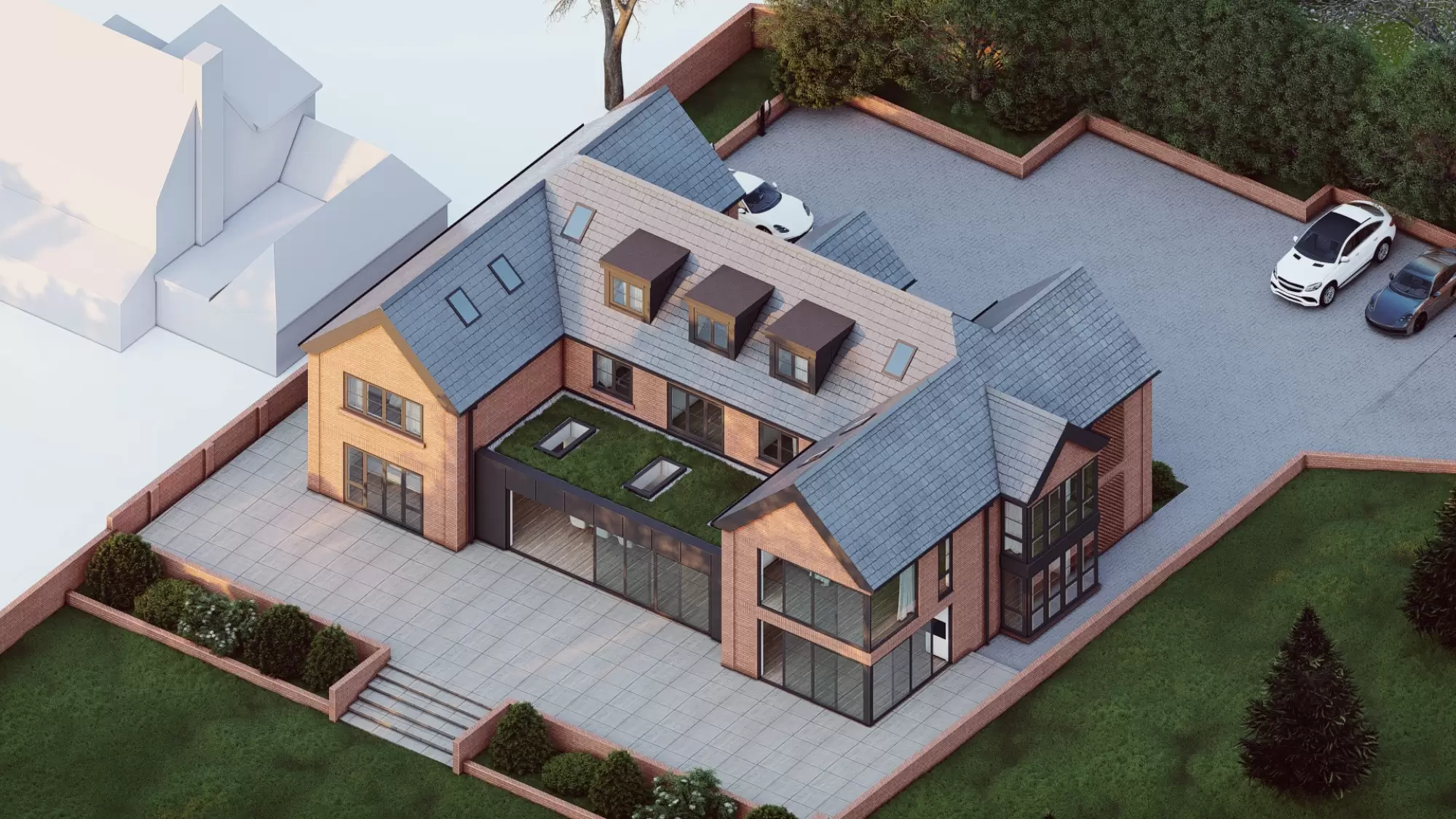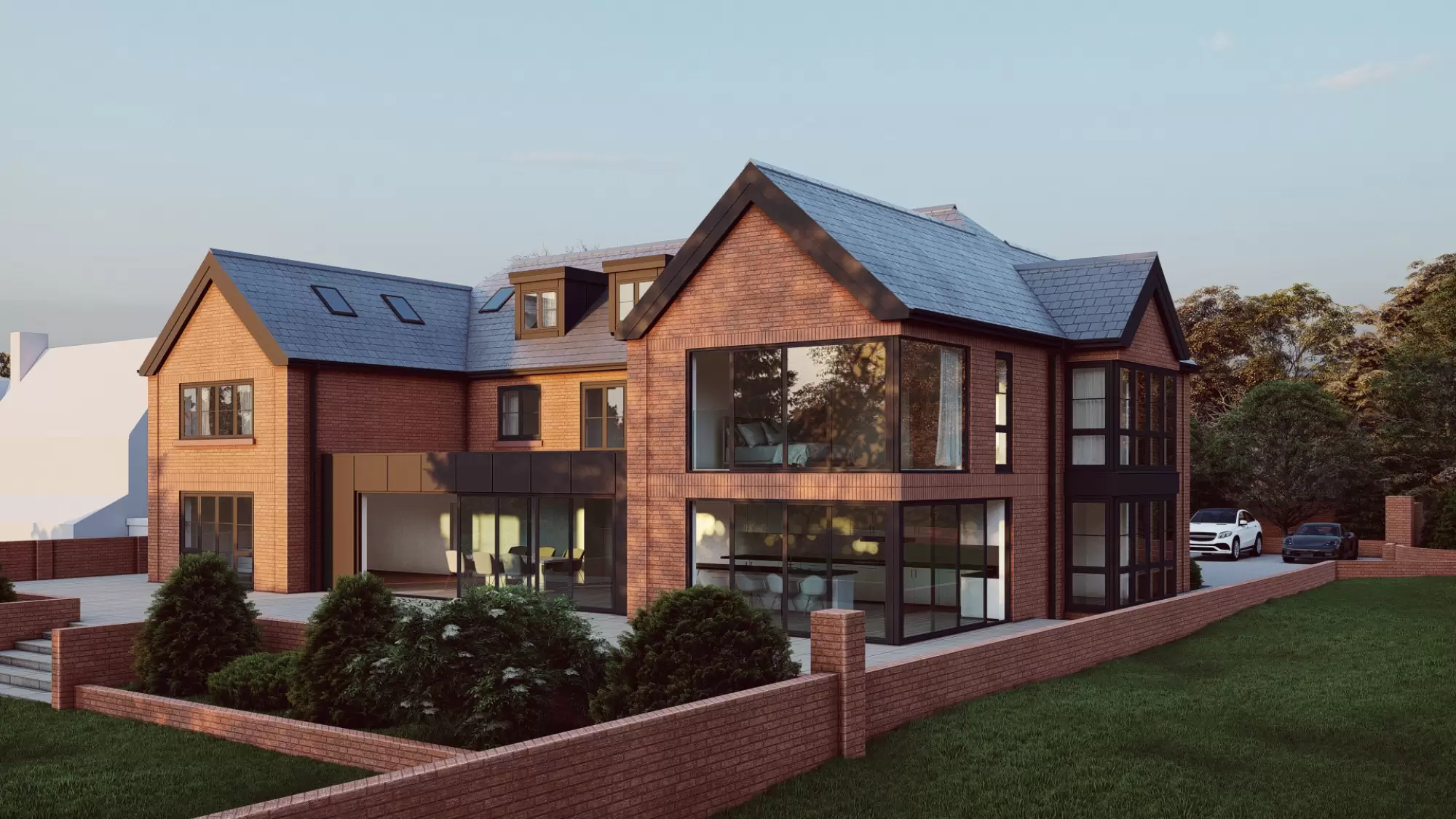 This project evolves from an earlier approved contemporary scheme, adopting a more traditional aesthetic with modern detailing to create a bespoke family home.