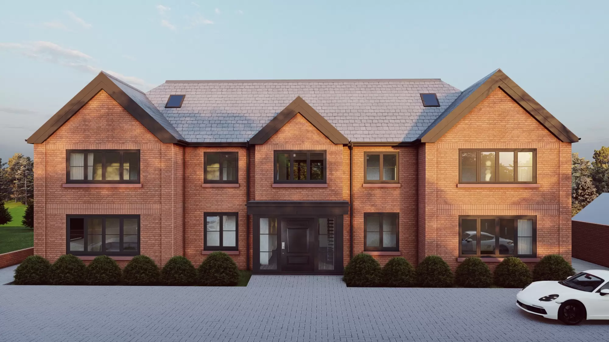 The façade combines traditional gable forms with carefully aligned openings and detailed brickwork to achieve a thoughtful and functional appearance. Expansive glazed elements on the rear elevation seamlessly connect the interior with the surrounding countryside vistas.