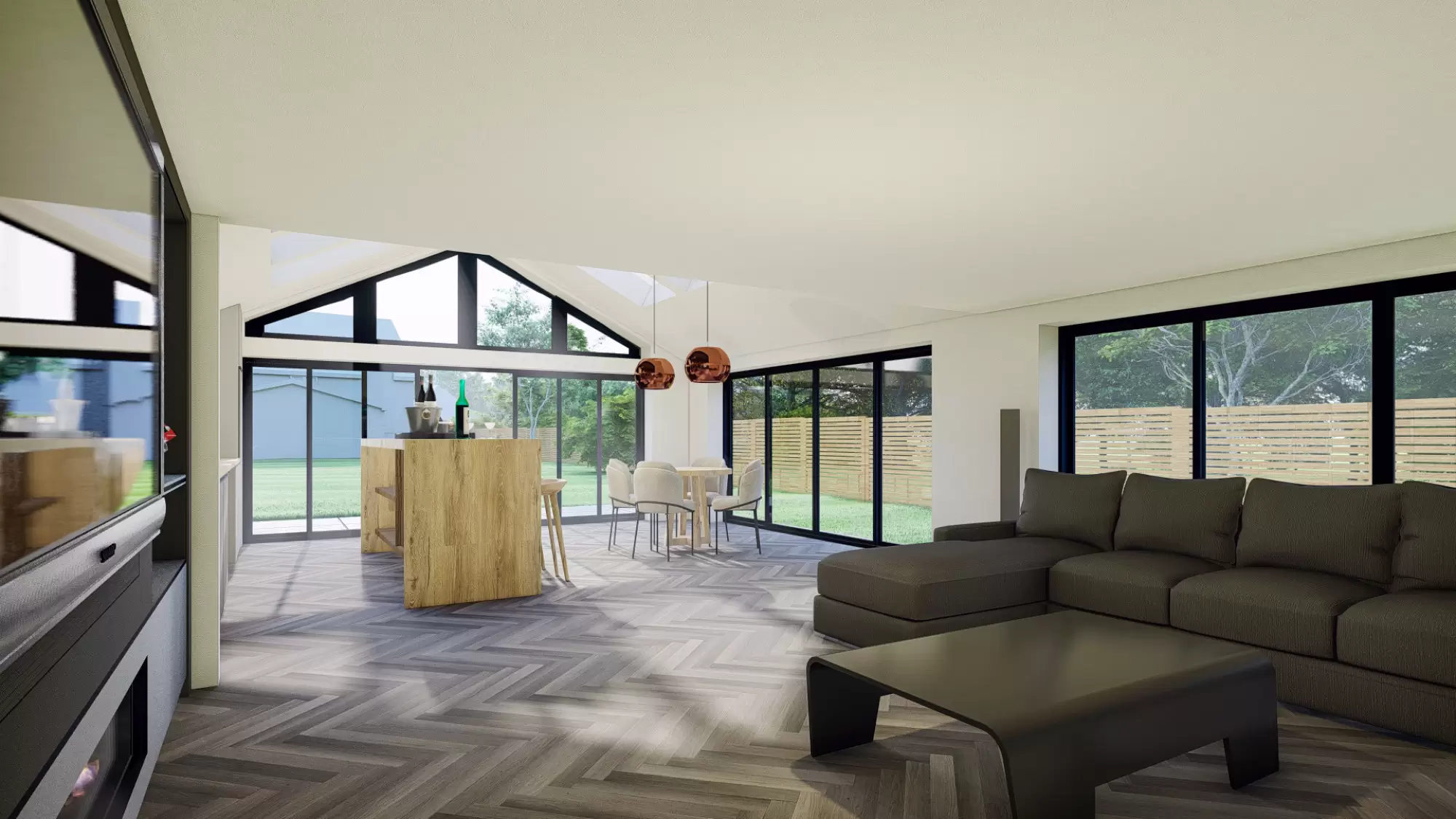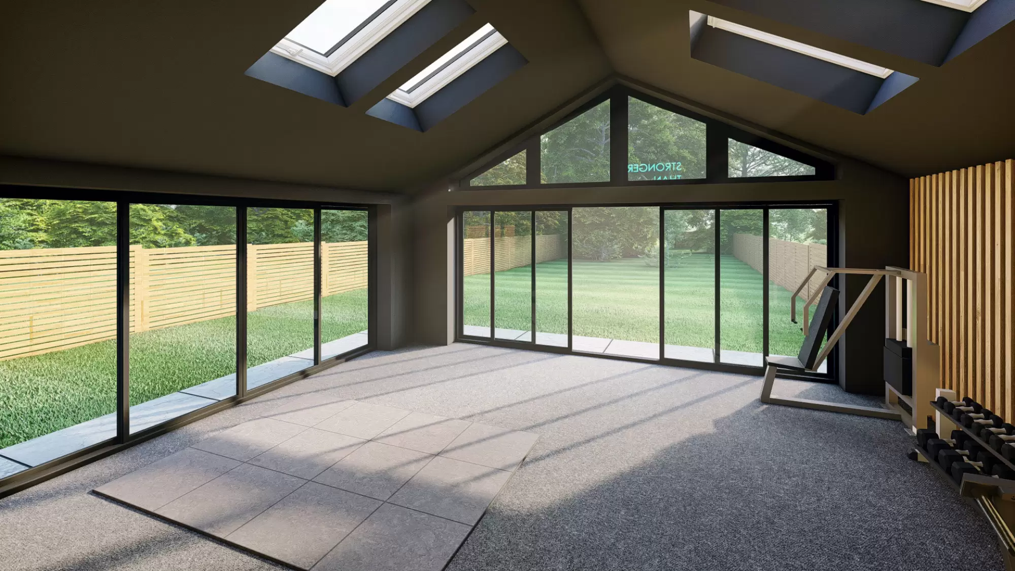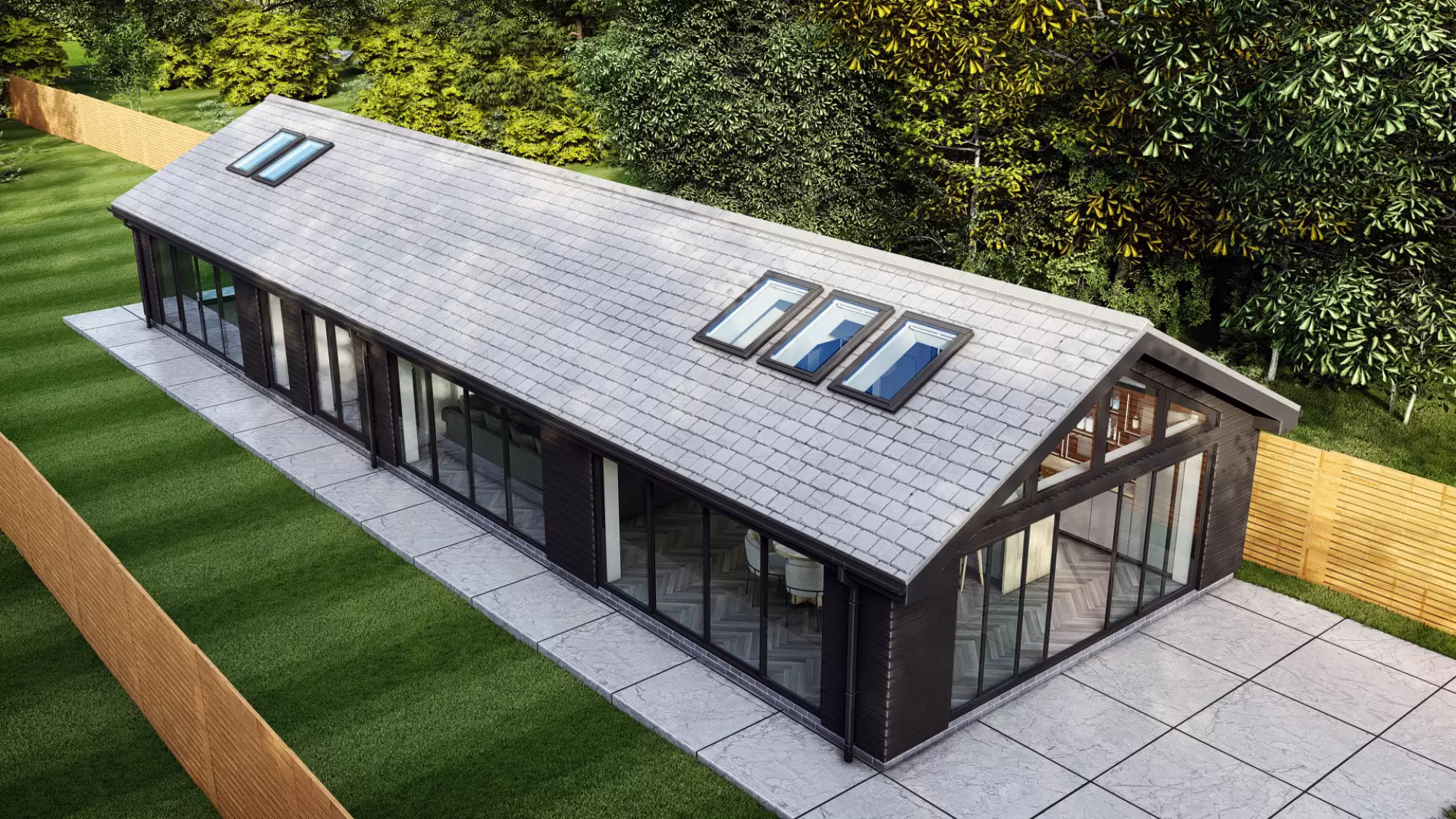 The new outbuilding blends modern design with functionality featuring sleek black cladding, complemented by expansive glazed panels and rooflights that flood the interior with natural light.