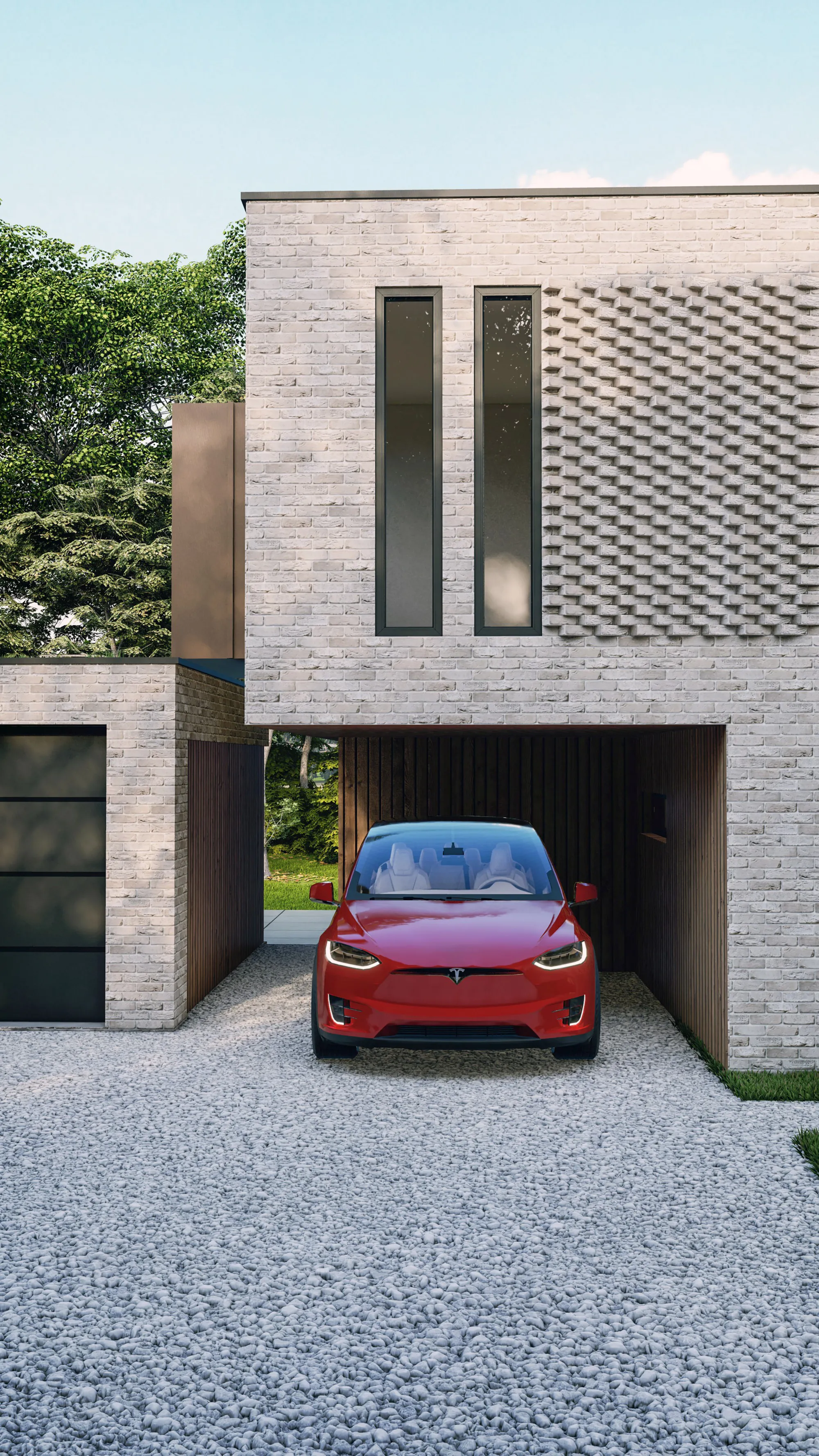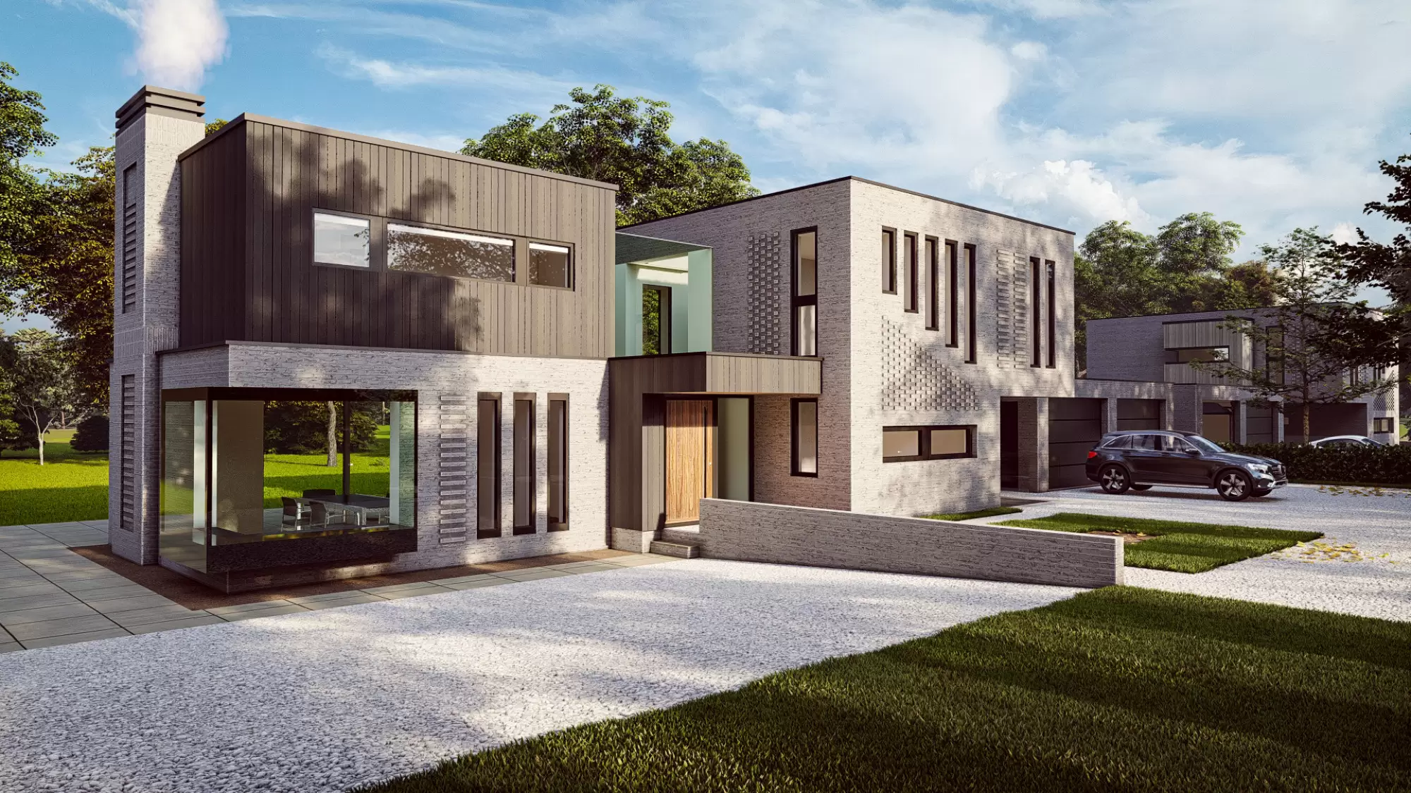 The rear elevation spaces overlook the rear garden and golf course, the views are framed via a rear canopy with IG Masonry Brick Soffit system which provides protection from solar gain in the summer months. The development has been designed to be sustainable, using renewable energy solutions such as ground source heating, rainwater harvesting, solar panels and recyclable materials.