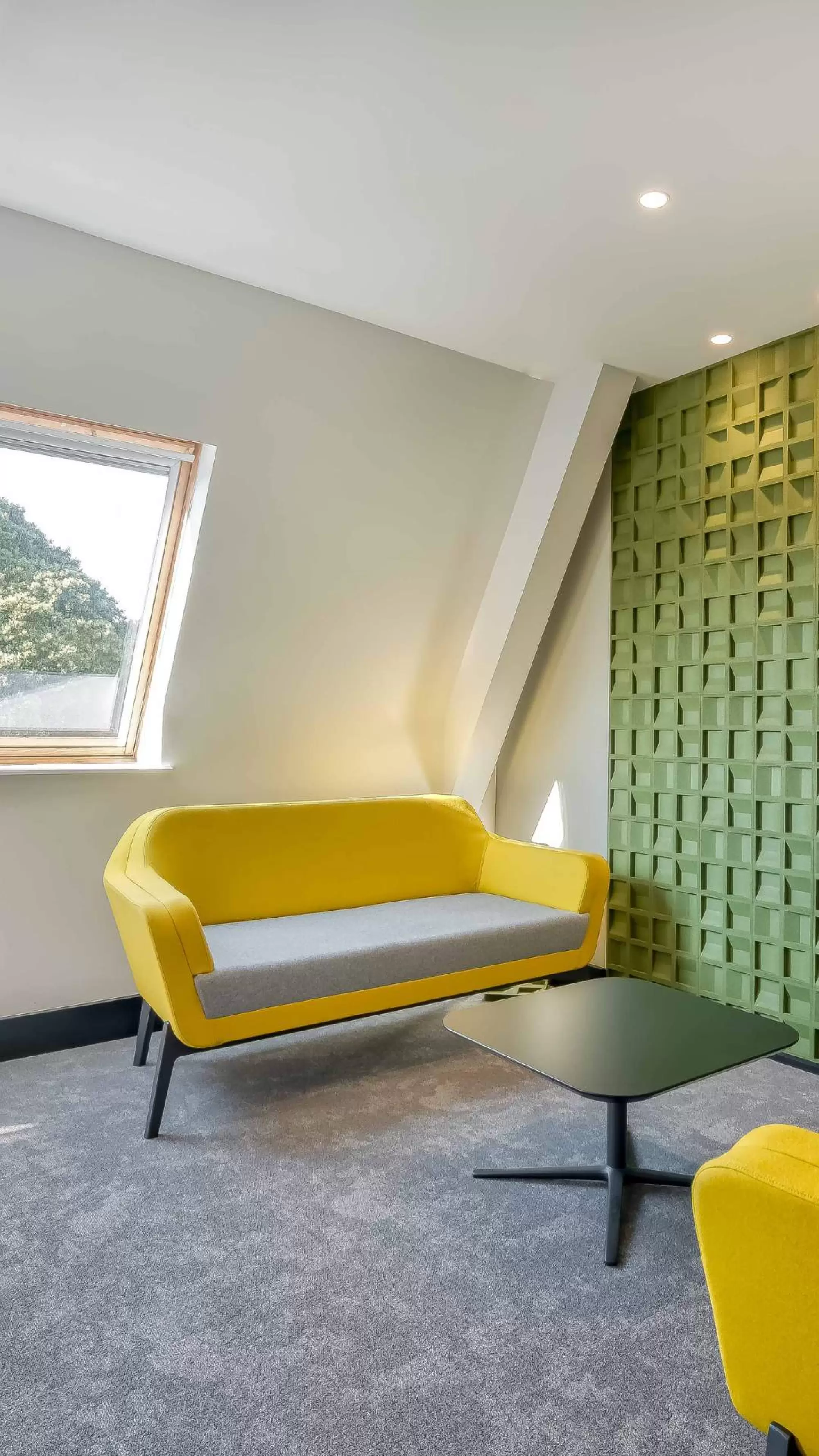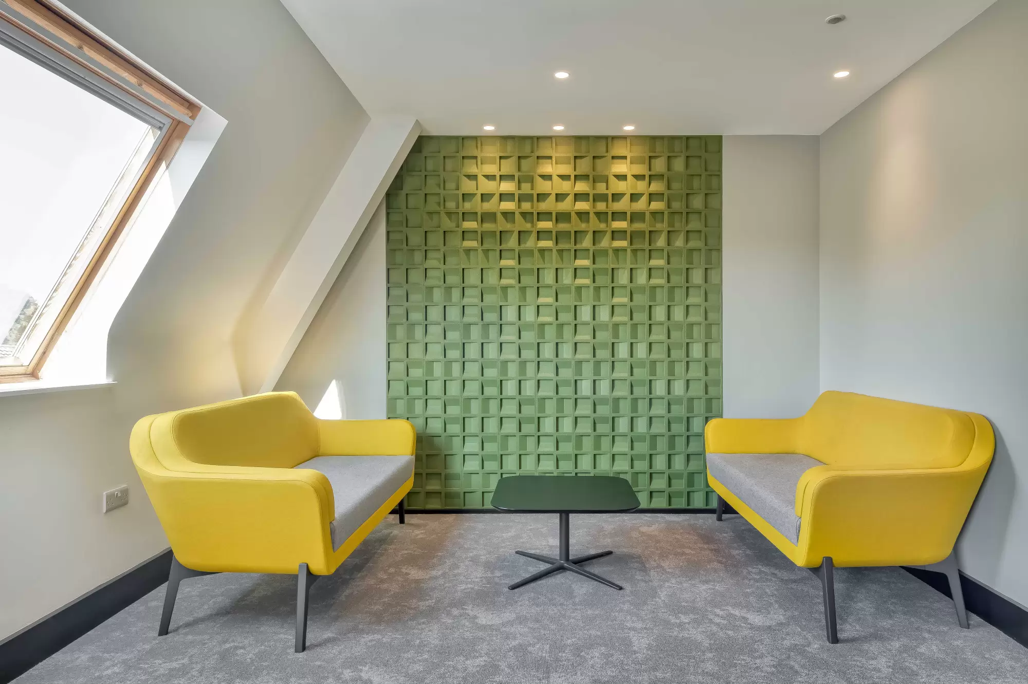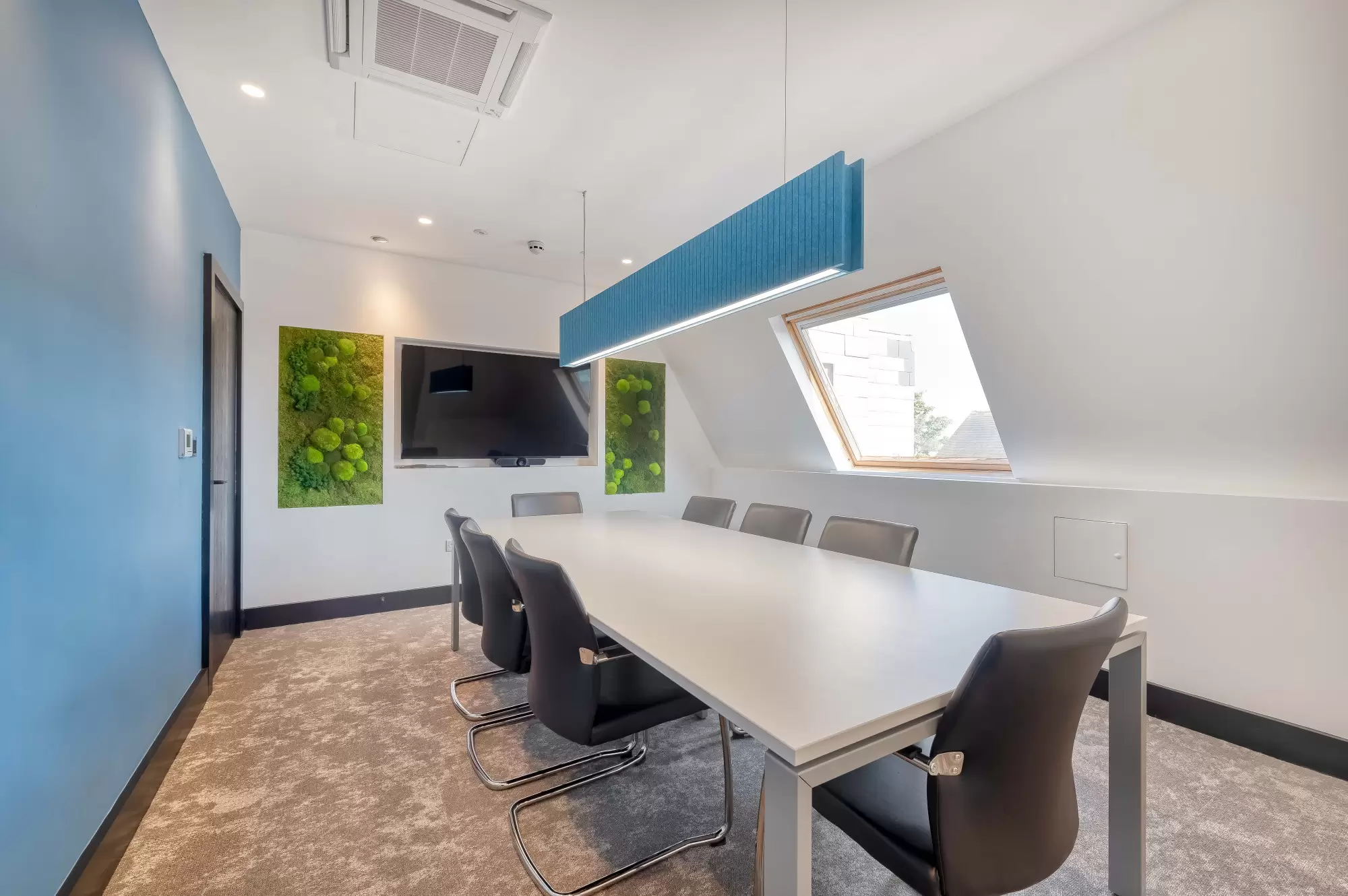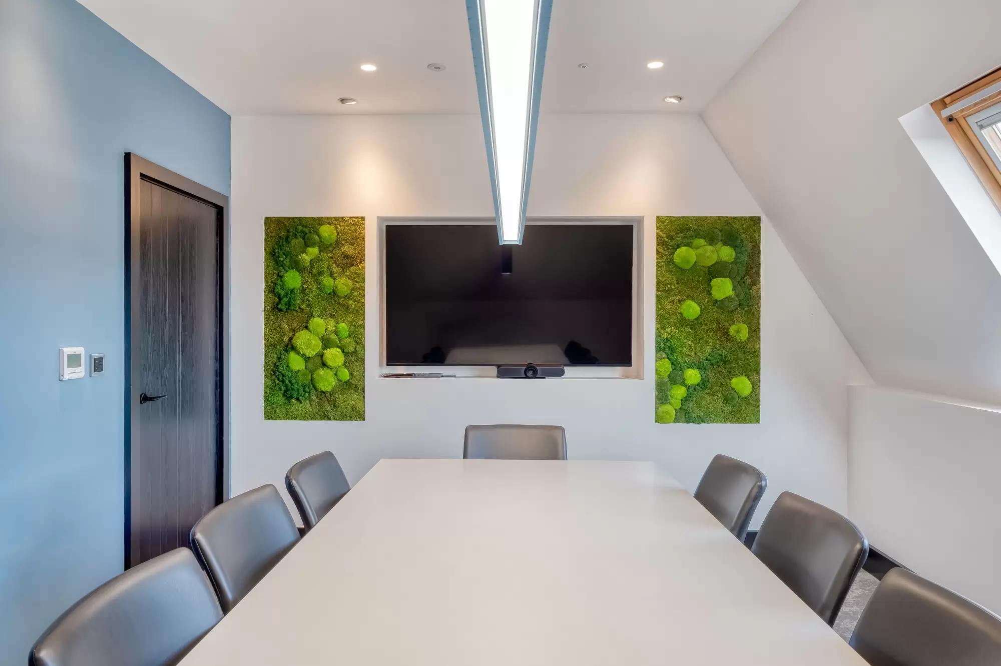 The breakout space incorporated 90 no. acoustic cork 3D panels on the wall, a splendid feature and acoustic performance. The meeting rooms incorporated large rectangle moss panels, providing a natural sound absorbent feature and acoustic performance, we also incorporated linear impact acoustic Decipio light over the board room table and impact acoustic circular pendants over the meeting rooms tables.