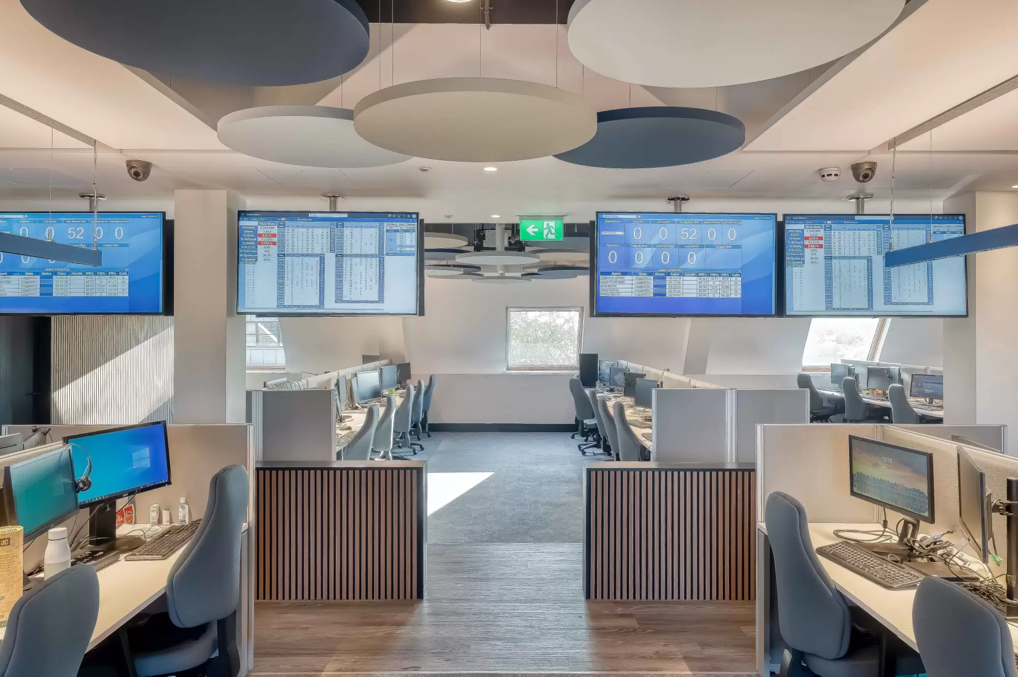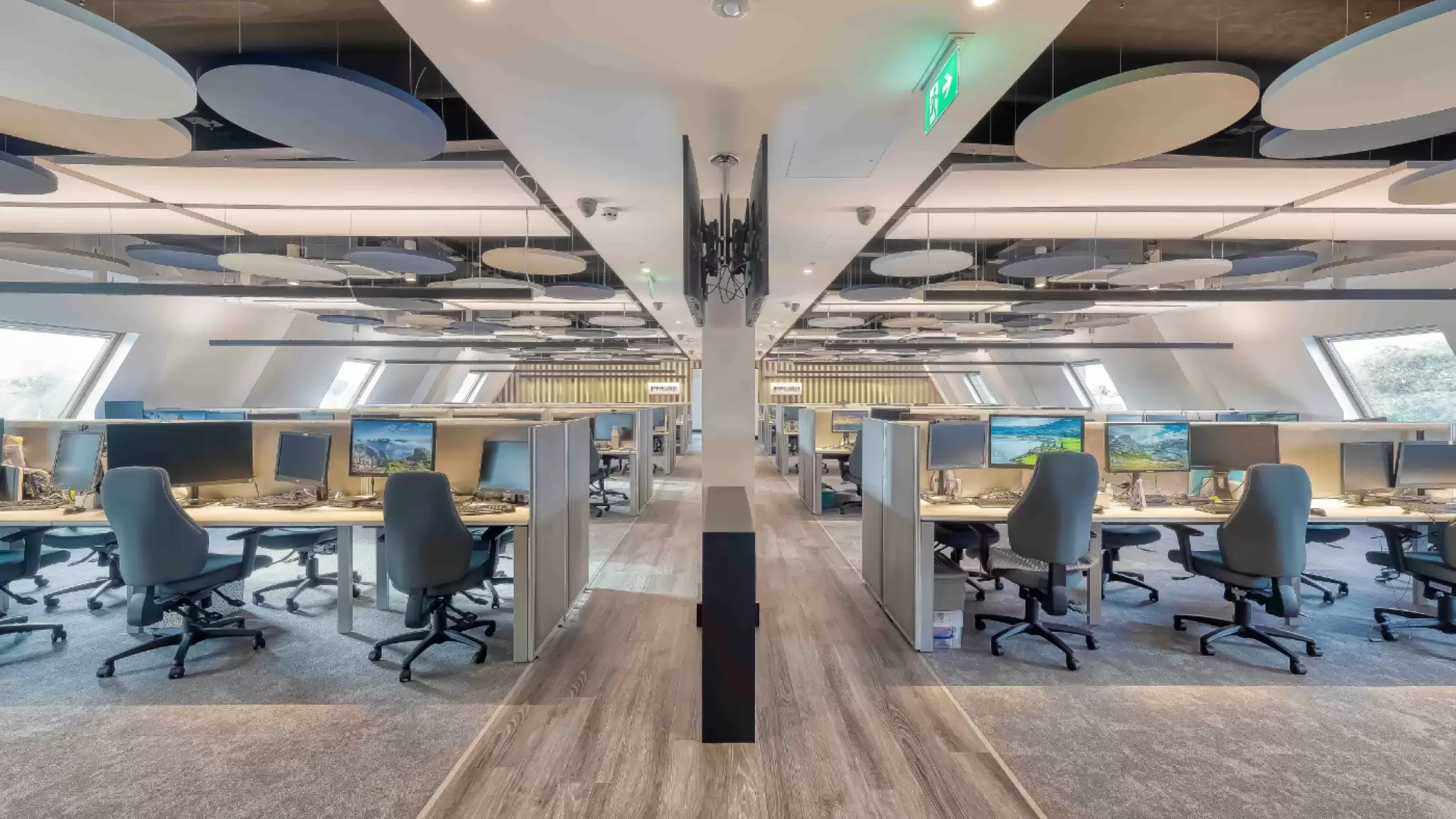 The space consisted of two general meeting spaces, a board room, kitchen and break out areas for the team. The main space was to allocate one hundred team members with linear desks and views of the data screens in the central aisle.