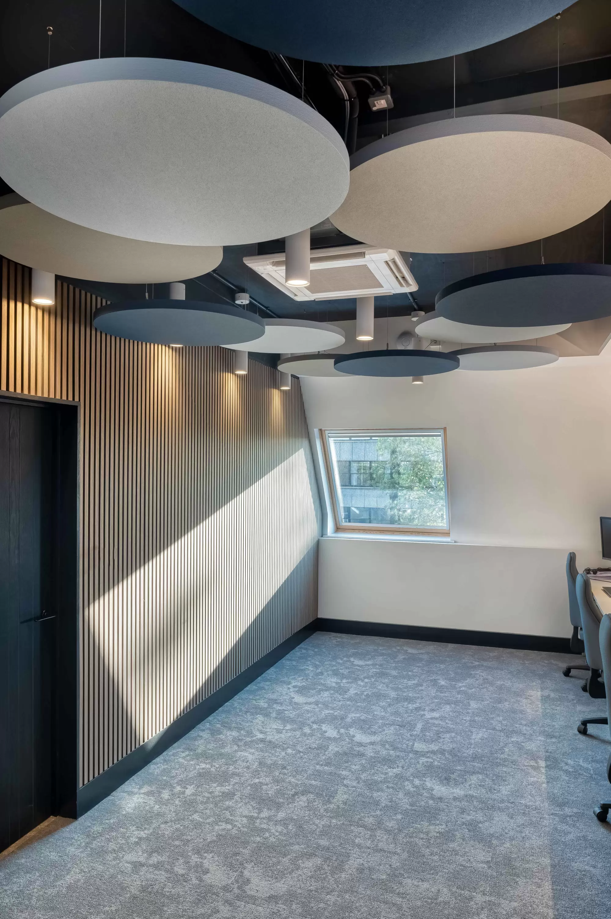 The main challenge was to create an acoustic controlled environment, with all materials introduced into the scheme to have great acoustic performance, from carpets, desk divides and selected acoustic panels on the walls. The main acoustic ceiling treatment to the space was the 120 no. 800mm acoustic solo rafts/circles manufactured in three assorted colours and set at various levels from the desktop.