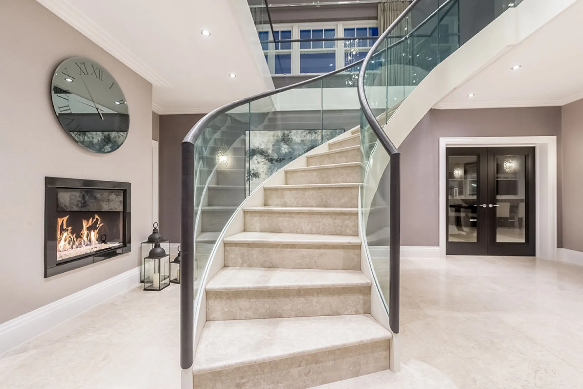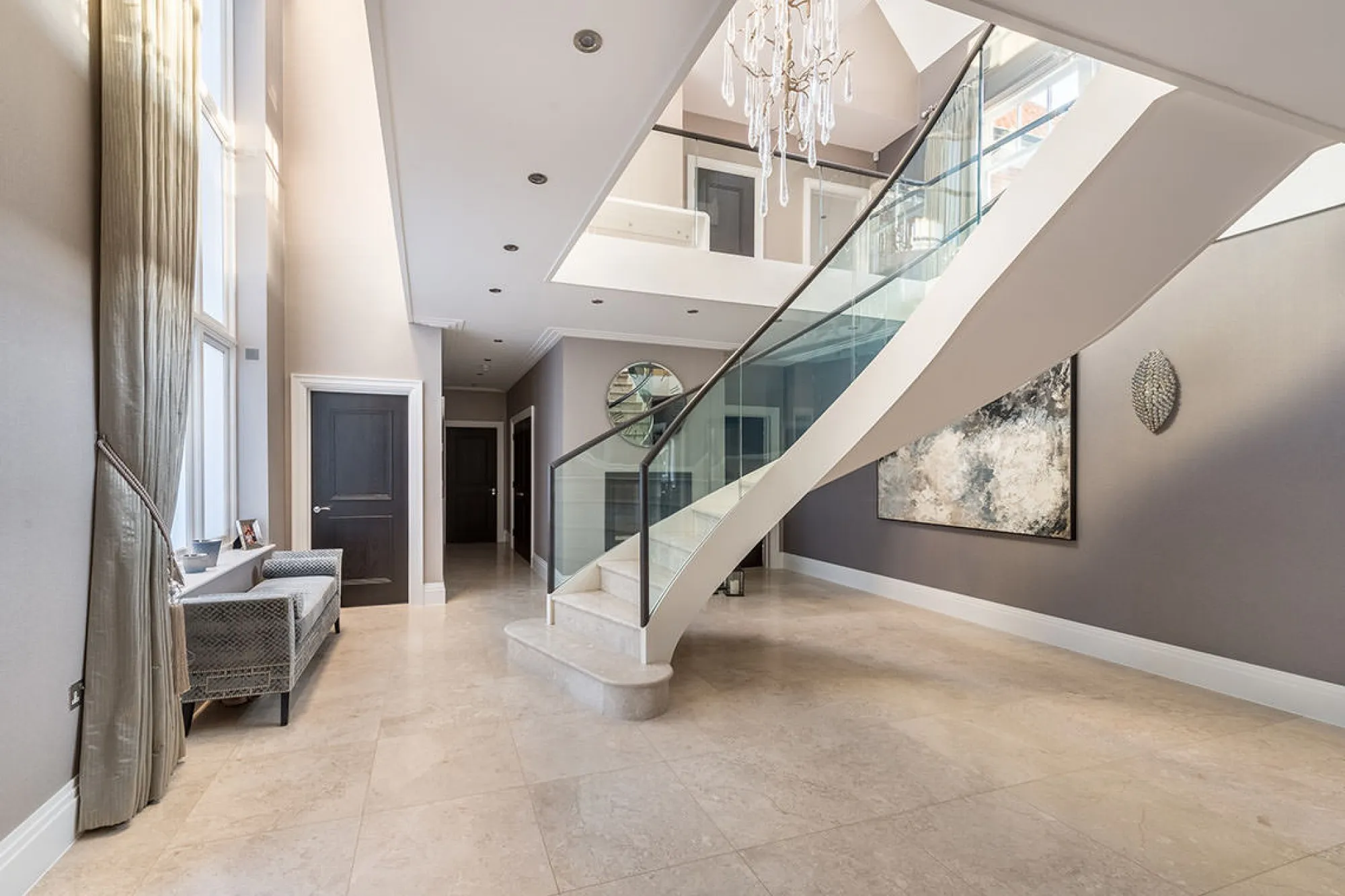 The design includes a centralised 4 storey vaulted entrance hall with a feature curved staircase, a second-floor bridge that spans the void, roof windows and the two-storey front window with privacy switchable glass.