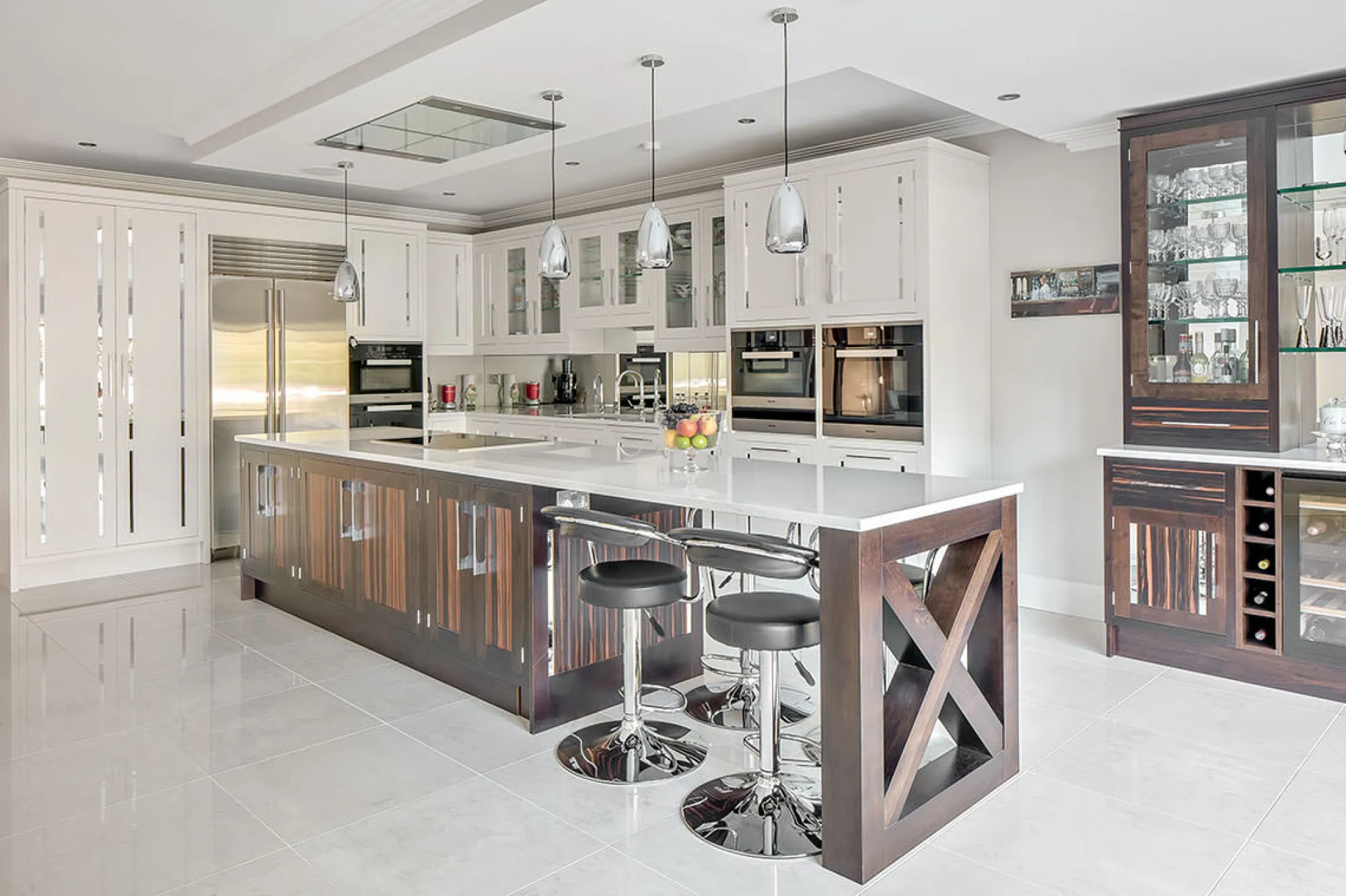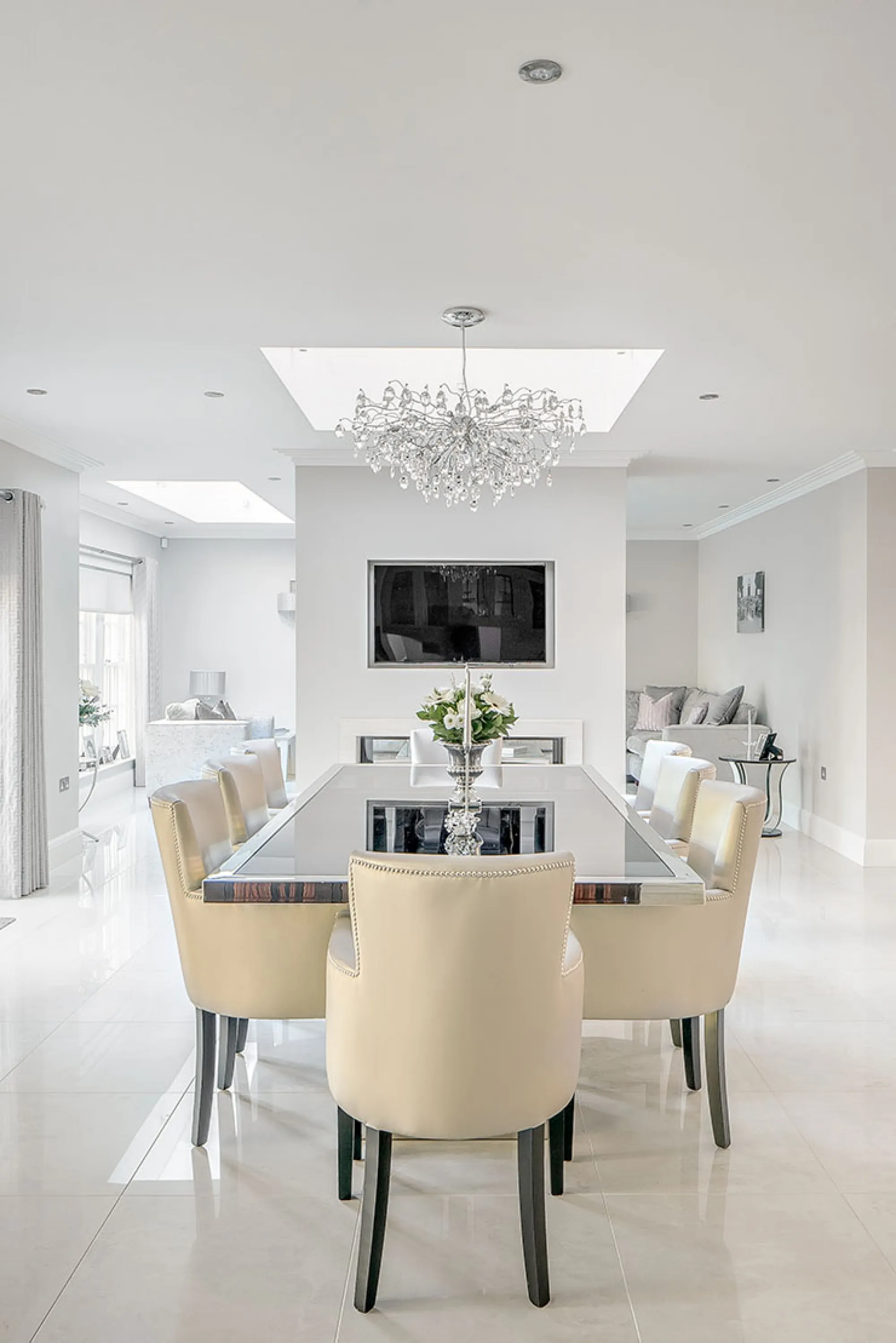 A centralised two storey main entrance hall with a bold white and hardwood walnut staircase sits comfortably within, the hallway opens into the rear open plan, kitchen, dining and family room space, the space was designed across the full width of the house and a doubled sided gas fire separates the dining and family room zones internally.