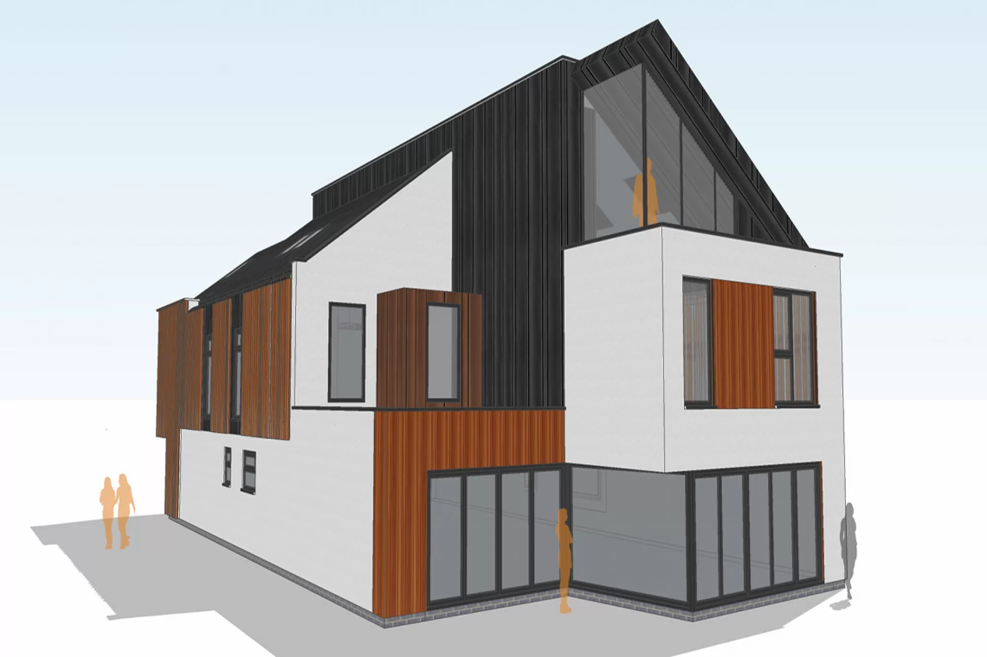 Our client desired a striking contemporary house within a traditional street scene, the staggered building line was the challenge, and a traditional pitched house form was derived with a contemporary twist.