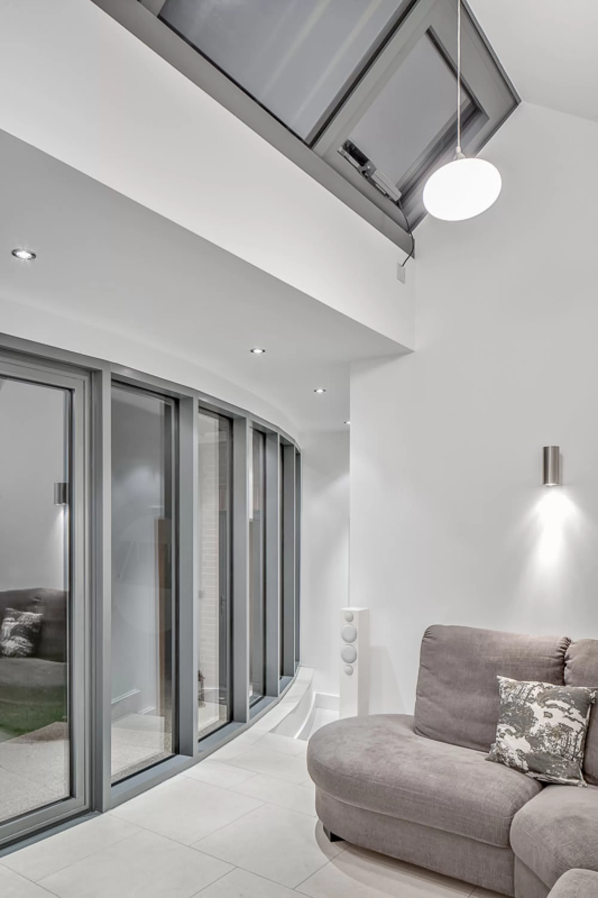 The design incorporated a ground floor bathroom, study and storage facilities, set back from a glass curved facade. Roof windows were designed into the zinc roof to allow further natural light into the rear study area and bathroom.